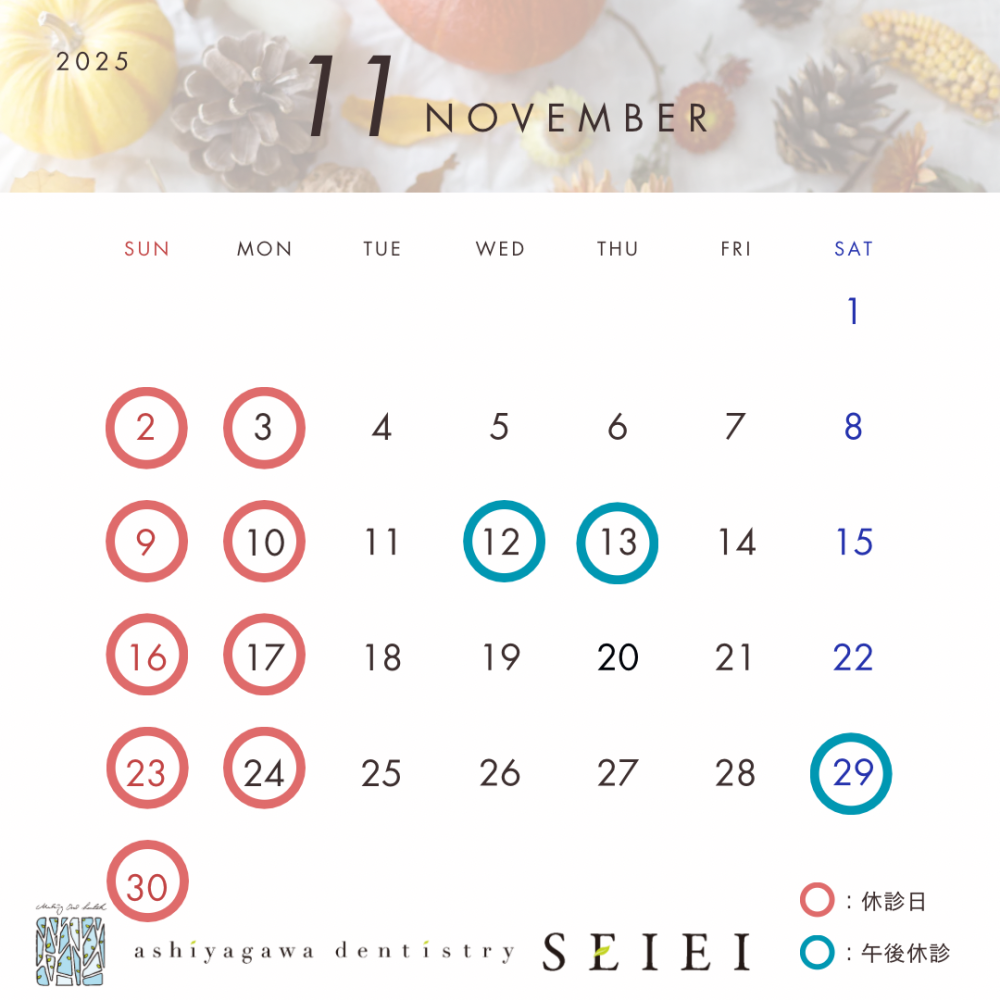 ・11/12(水)、11/13(木)、11/29は午後から休診となります。